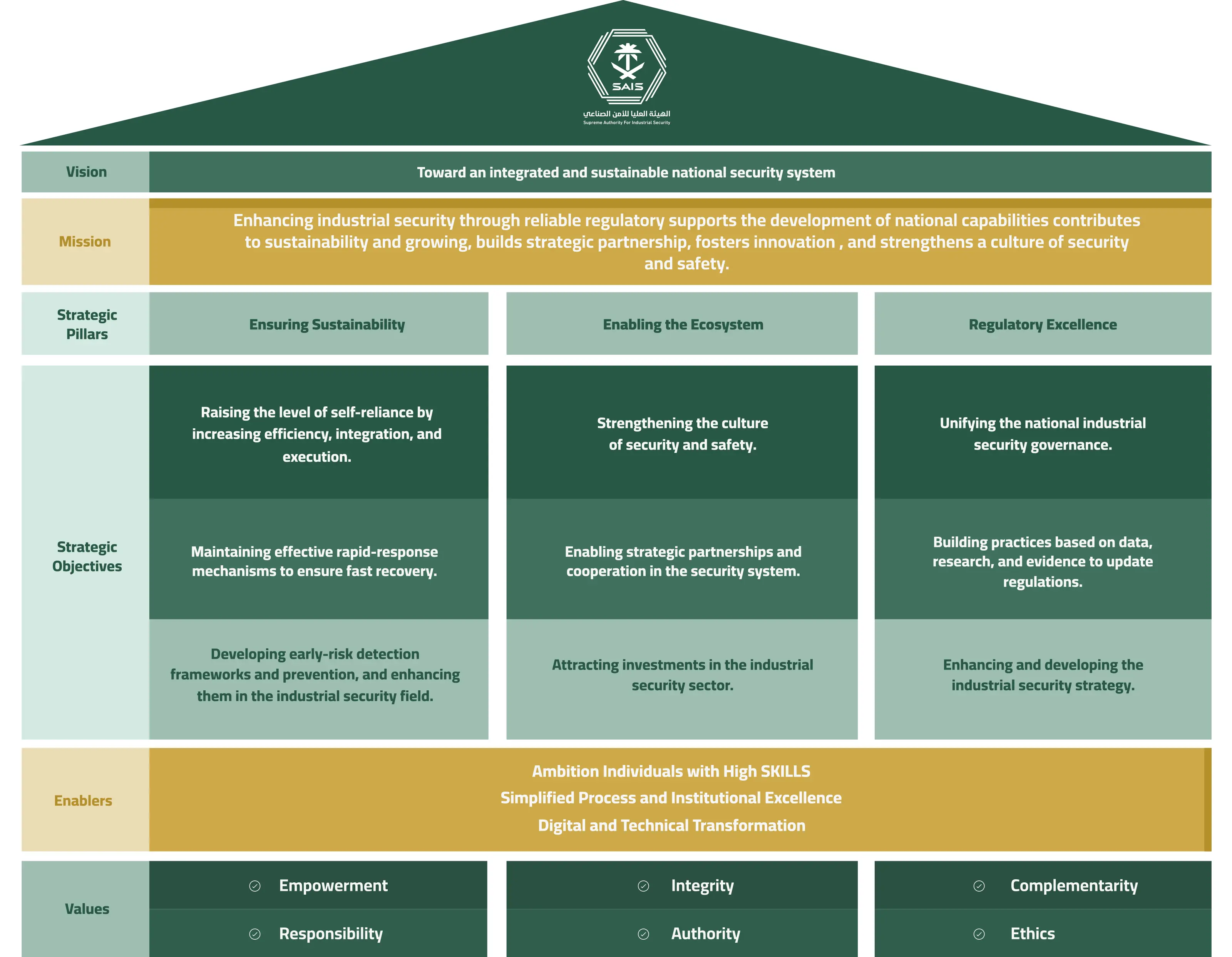 In line with the strategic directions of the Kingdom of Saudi Arabia, the Supreme Authority for Industrial Security seeks to align with the objectives of Saudi Vision 2030 by developing systems and procedures that enhance the efficiency and sustainability of industrial security, promote innovation in safety and prevention, and adopt the latest advanced technologies and equipment.